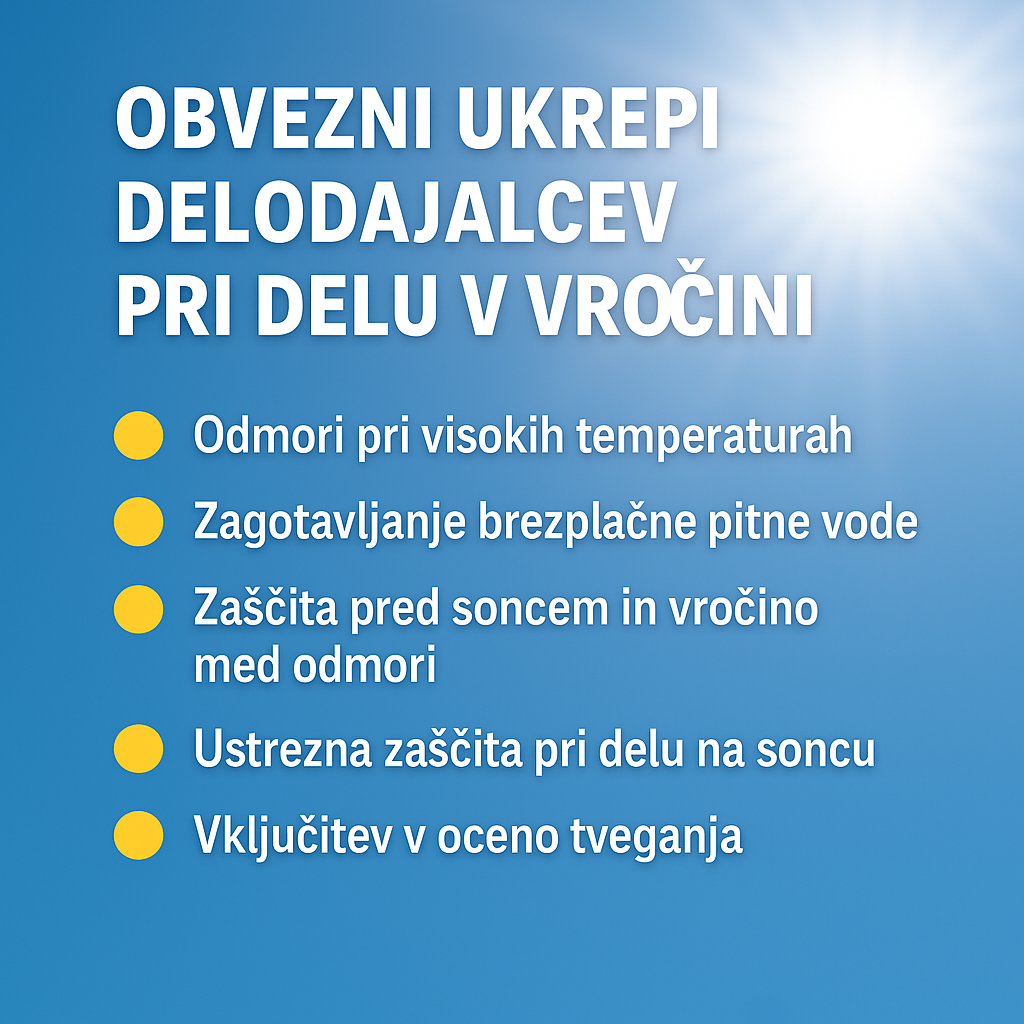 Z uveljavitvijo Pravilnika o dopolnitvah Pravilnika o zahtevah za zagotavljanje varnosti in zdravja delavcev na delovnih mestih (Uradni list RS, št. 53/2025) so od julija 2025 dalje obvezni dodatni ukrepi za zaščito delavcev pred tveganji zaradi vročine pri delu na prostem.
